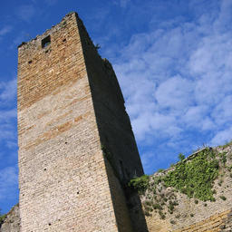 Au sud, un profond fossé entaille le plateau, atteignant par endroits dix mètres de profondeur et près de vingt mètres de largeur. Le creusement de celui-ci a fourni la pierre nécessaire aux premières constructions, gros appareil de couleur ocre jaune est encore visible à la base des murs ; ce fossé constituait un obstacle difficilement franchissable, et c’est en longeant celui-ci que l’on apprécie le mieux la masse imposante des fortifications.