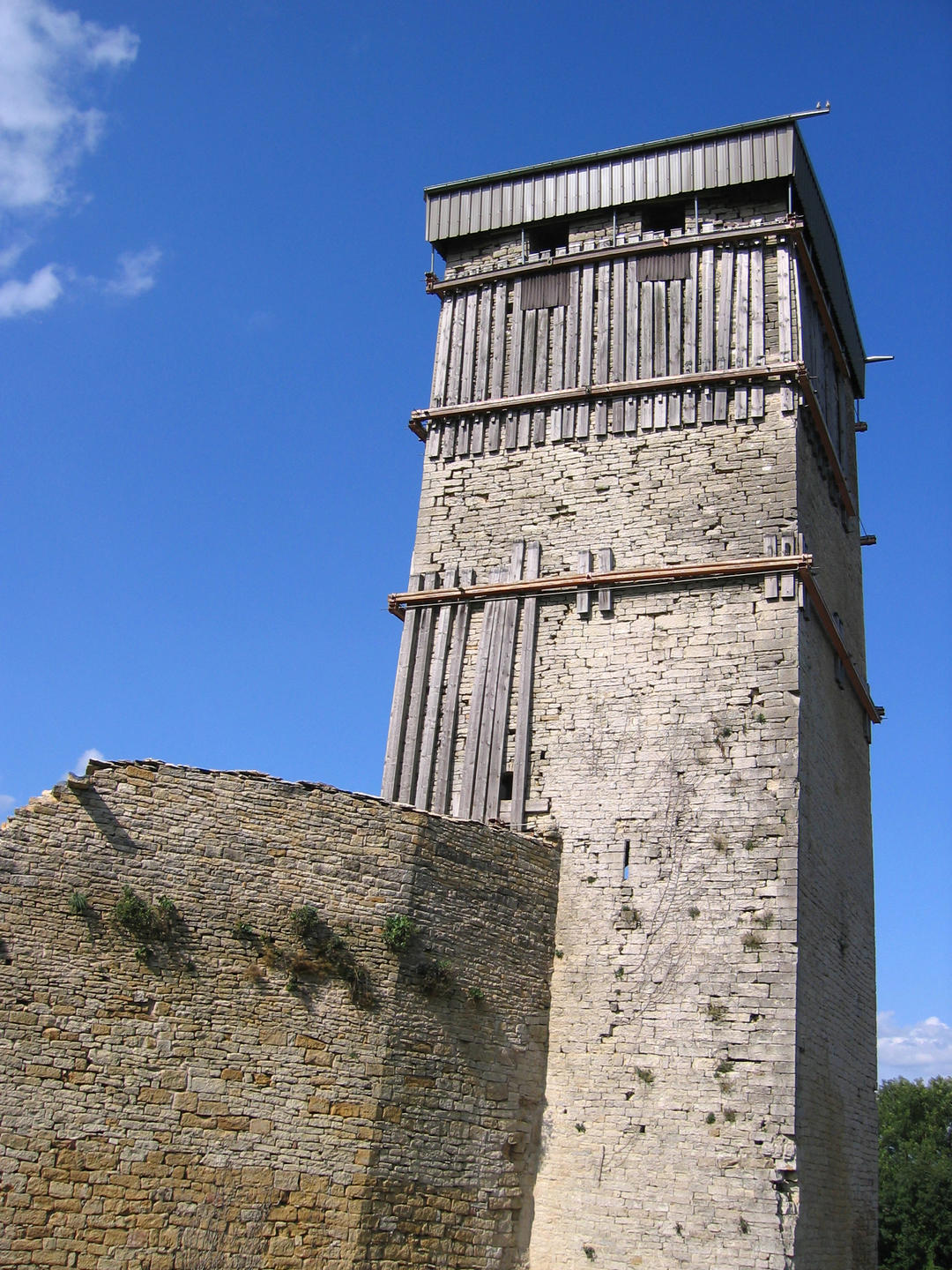Les étages supérieurs de la tour, séparés par des planchers en bois posés sur corbeaux, reliés par des échelles de meunier et éclairés par de rares meurtrières, donnent accès au sommet de la tour où se concentre l’essentiel des moyens de défense. Dans cette pièce, deux baies par face contrôlent les terres environnantes. Sous ces ouvertures, trois trous permettaient le montage de hourds. Vers le XVe siècle, cette tour est couverte de tuiles vernissées, retrouvées en grand nombre à l’intérieur. Mais rien ne nous autorise aujourd’hui, à décrire précisément le couvrement de cet édifice à l’époque de sa construction.
