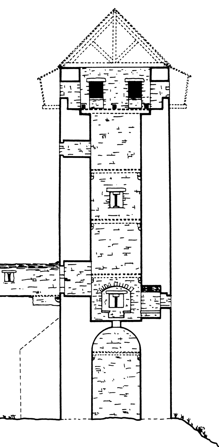Pièce basse, planchers sur corbeaux et échelles de meunier. En partie haute, présence supposée du toit et des hourds.